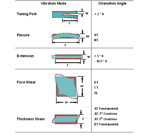 經由不同的石英切割角度及不同電極型狀的電場效應, 石英芯片展現了各種不同的振動模態. 以經常產生的振動模態可以概分為擾曲模態(flexure mode), 伸縮模態(extension mode), 面剪切模態(face shear mode) 和 厚度剪切模態(thickness shear mode). "1XSF026000AR"這幾種振動模態以簡單的方法在表一中可以看到. 在實際狀況中, 石英芯片并不是一定祇有單一種振動模態, 而可能有多種模態同時存在在一個石英芯片的振蕩中, 經由適當的設計, 可以壓制其它不希望產生的振動模態(unwanted mode), 來達到主要振動模態的最佳化.