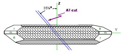 在各種不同種類的切割角度方式中, AT角度切割的石英芯片適用在數(shù)MHz到數(shù)佰MHz的頻率范圍,是石英芯片應用范圍最廣范及使用數(shù)量最多的一種切割應用方式. 在(圖五)中, 從石英晶棒X-軸向的上視圖, 可以看到對Z-軸向旋轉約35度的AT 方向. 這在大量生產的技術上也是很好達成的一種作業(yè)方式.境保護方針.jpg)