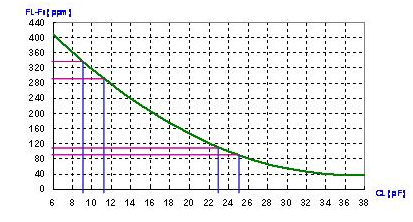 在(如圖)中, CL=24 pF 時(shí)的頻率敏感度是10 ppm/pF, 及CL=10 pF時(shí)的頻率敏感度是20 ppm/pF. 在并聯(lián)線路中, 負(fù)載電容越小, 頻率對(duì)負(fù)載電容變化的敏感度越高. 相反的, 負(fù)載電容越大, 頻率對(duì)負(fù)載電容變化的敏感度越低. 這就是"BRA2500003"石英晶體共振子用于VCXO線路上時(shí), 線路設(shè)計(jì)上會(huì)選用較小負(fù)載電容. 反之, 在要求較準(zhǔn)確的頻率信號(hào)時(shí), 線路設(shè)計(jì)上會(huì)選用較高的負(fù)載電容.