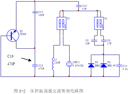 2.壓控振蕩器(VCO):將1S的1或2撥上,2S的1撥下、2撥上(不接CRY1石英晶體),則變?nèi)荻O管1D、2D并聯(lián)在電感2L兩端。當(dāng)調(diào)節(jié)電位器W1時,1D、2D兩端的反向偏壓隨之改變,從而改變了1D和2D的結(jié)電容Cj,也就改變了振蕩電路的等效電容,使振蕩頻率發(fā)生變化。其交流等效電路如圖3-2所示。