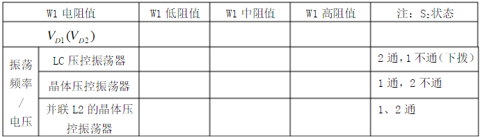 2)將W1從低阻值、中阻值到高阻值位置,分別將變?nèi)荻O管的反向偏置電壓(萬用表測)、輸出頻率和輸出電壓記于下表3-2中。