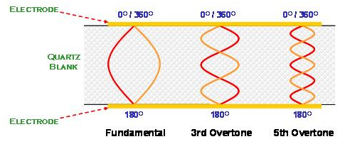 在AT切割角度的石英晶體共振子主要是以厚度剪切振蕩模態存在. 石英晶體在共振時, 除了基本波振蕩之外, 高階的倍頻共振也與基本波振蕩同時存在于石英晶體的電極區域之間. 但是, 由于壓電材料的電極是電氣相位相反的振動環境, 所以, 祇有奇數倍(odd number)的高頻倍頻可以發生, 偶數倍(even number)的倍頻共振在石英晶體共振子是不會存在的(圖十).