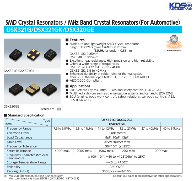 更多>>KDS車規級陶瓷晶振7AD02400A38 DSX321G 24M