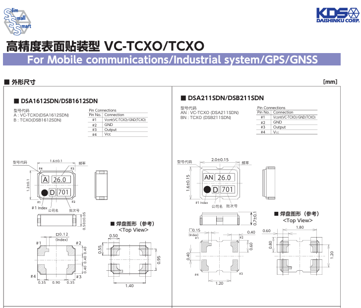 更多>>7EG02600A0S日本KDS小尺寸溫補晶振DSB1612SDN 26M TCXO