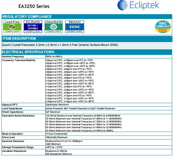 EA3250FA18-25.000M TR Ecliptek石英晶體 EA3250 MHz 晶體 25 MHz ±50ppm ±30ppm 18pF CRYSTAL 25.0000MHZ 18PF SMD