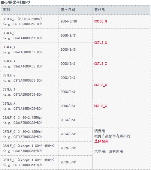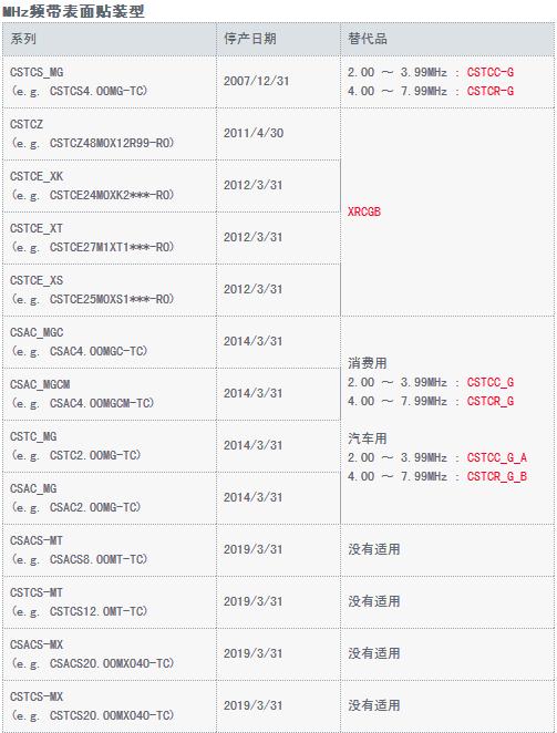 這次一共有三種類型的村田晶振被判出局,分別是MHZ頻帶表面貼裝型、MHZ頻帶引腳型、KHZ頻帶引腳型。接下來,壹兆電子會(huì)將Murata晶振停產(chǎn)的產(chǎn)品型號、日期和可代替產(chǎn)品料號完整的提供,請廣大新老客戶按照型號或系列對照,若有自己常用的型號請及時(shí)與我司壹兆電子業(yè)務(wù)人員聯(lián)系!