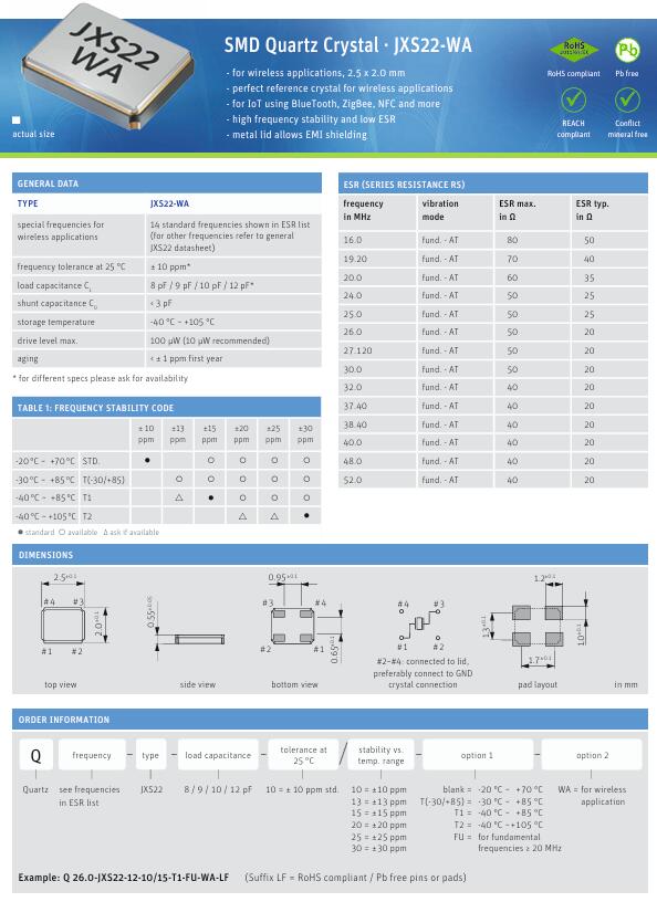 Jauch晶振Q 20.0-JXS22-12-10/10-FU-WA-LF 2520 20M 12PF 10PP